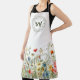 Brighten your kitchen with this charming personalized apron, featuring a vibrant meadow of wildflowers blooming along the hem. The upper chest displays a delicate, hand-illustrated leafy wreath encircling a bold, customizable monogram for a truly unique touch. With its crisp white background and pops of red, blue, and yellow flora, this apron perfectly captures the essence of a spring garden. It's a wonderful gift for gardeners, bakers, and home chefs who love to bring a bit of the outdoors inside.