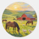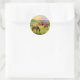 Meadowlight Morning round sticker featuring peaceful countryside scenery bathed in soft morning light. Printed on glossy white paper for vibrant colour and a smooth finish. Perfect for planners, journals, scrapbooks, gift wrapping, and everyday decorating. A calm and uplifting way to bring pastoral beauty to your favourite surfaces.