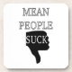 Black and white typography. A human hand with the thumb down. Text: Mean People Suck. Custom coasters.