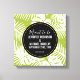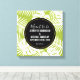 A wedding commemorative canvas print with a repeating pattern of large palm leaves on an olive green background. Trendy modern and tropical. A black circle with a gold inner border layered over top with your personalised details inside.