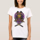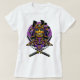 and the mouth is open in a menacing snarl. The colour palette is a combination of gold, purple, and black. Two crossed katanas,