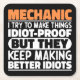 Funny Mechanic Sayings "Mechanic I Try To Make Things Idiot Proof But They Keep Making Better Idiots". Grab this Funny Mechanic design as a funny gifts for an awesome mum, dad or friend.