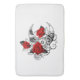 Contour, mechanical crescent moon with gears, decorated with red roses with black spiked stems and leaves on white background. Steampunk