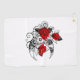 Contour, mechanical crescent moon with gears, decorated with red roses with black spiked stems and leaves on white background. Steampunk