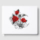 Contour, mechanical crescent moon with gears, decorated with red roses with black spiked stems and leaves on white background. Steampunk