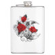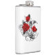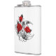 Contour, mechanical crescent moon with gears, decorated with red roses with black spiked stems and leaves on white background. Steampunk