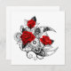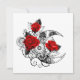 Contour, mechanical crescent moon with gears, decorated with red roses with black spiked stems and leaves on white background. Steampunk