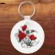 Contour, mechanical crescent moon with gears, decorated with red roses with black spiked stems and leaves on white background. Steampunk