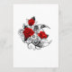 Contour, mechanical crescent moon with gears, decorated with red roses with black spiked stems and leaves on white background. Steampunk