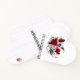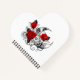 Contour, mechanical crescent moon with gears, decorated with red roses with black spiked stems and leaves on white background. Steampunk