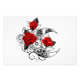 Contour, mechanical crescent moon with gears, decorated with red roses with black spiked stems and leaves on white background. Steampunk