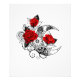 Contour, mechanical crescent moon with gears, decorated with red roses with black spiked stems and leaves on white background. Steampunk