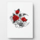 Contour, mechanical crescent moon with gears, decorated with red roses with black spiked stems and leaves on white background. Steampunk