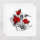 Contour, mechanical crescent moon with gears, decorated with red roses with black spiked stems and leaves on white background. Steampunk