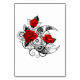 Contour, mechanical crescent moon with gears, decorated with red roses with black spiked stems and leaves on white background. Steampunk