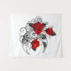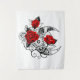 Contour, mechanical crescent moon with gears, decorated with red roses with black spiked stems and leaves on white background. Steampunk
