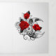 Contour, mechanical crescent moon with gears, decorated with red roses with black spiked stems and leaves on white background. Steampunk