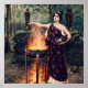 The scene unfolds in a mysterious woodland ritual setting. Medea stands poised beside a smoking cauldron, sprinkling enchanted ingredients into the glowing brew. Behind her rise solemn statues and a shadowed forest altar, heightening the atmosphere of ancient magic and myth. At her feet lie ritual objects and remnants of sacrifice, emphasizing the darker power associated with Medea’s legendary spells.