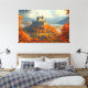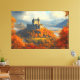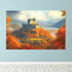 This painting showcases a grand mediaeval castle perched atop a hill, surrounded by a breathtaking autumn landscape. The castle’s towering spires and fortified walls rise above a forest of vibrant orange, red, and gold foliage. In the background, rolling mountains and a serene lake stretch into the horizon, bathed in soft golden sunlight. Wisps of mist hover over the valleys, adding a mystical quality to the scene. The warm hues of fall contrast beautifully with the castle’s cool stone, creating a striking and majestic atmosphere.