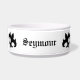 Tilted black royal gothic mediaeval fleur de lis symbols surround a dog food bowl. Add your dog's name to it.