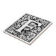 A black and white vector illustration of the letter in an elaborate mediaeval style, created in the style of Albrecht Dürer. The design is a square with a large central floral motif surrounded by symmetrical geometric patterns and swirls.