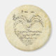 On a parchment background, an unusual heart-shaped mediaeval music manuscript, Cordier's ode to one who is "Bonne, belle, et sage", which is French for "good, lovely, and wise".