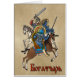 A depiction of a battle between a Russian bogatyr and an Asiatic warrior, both on horseback. Cyrillic (Russian) text reading "Богатырь"(Bogatyr) also appears. Bogatyri are heroic characters found in mediaeval Slavic epics. They are akin to the knights-errant of Western literature. Most of the stories about bogatyri revolve around the court of Vladimir I of Kiev (958–1015). Some bogatyri are presumed to be historical figures. Bogatyri protected Russian land and people against invaders, especially Tatars. Some were attributed powers and strength which were almost divine. This image is adapted from a black and white line drawing illustration in "Повесть о славных богатырях, златом граде Киеве и великой напасти на землю Русскую" (A Tale of Glorious Heroes From the Golden City Kiev and the Great Scourging of the Russian Land) by Tamara Likhiotal; published in the USSR in 1974.