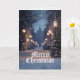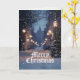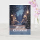 Mediaeval Village Winter Scene Merry Christmas greeting card. A wide walkway dimly lit by street lamps creates a magical glow on the falling snow.