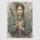 The design features a fierce warrior woman in a green tunic, gripping her sword with determination. Painterly textures and earthy tones give it a rich, hand-illustrated look that pairs beautifully with rustic wood, leather accents, or vintage-style projects.