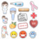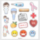A sheet of 15 clear peel off stickers comprising of doctors and surgeons wearing protective masks, patients in a wheelchair, signage saying "wash your hands" and "covid 19"; germs wearing masks; a nurse holding a syringe; a band aid or plaster; a pink breast cancer ribbon symbol; a thermometer; an EKG heart monitor and a heart that says "donate blood". Great for education purposes.