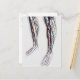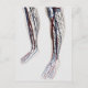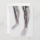 Medical illustration of arteries, veins and lymphatic system in human legs.