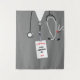 Creative doctor graduation congrats banner featuring scrubs and funny Swiss Army knife illustration for medical school grad event or celebration party. To personalise edit text to add physician's name and his or her medical credentials.