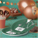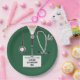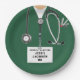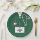 Creative doctor party plates for medical school grad featuring green hospital scrubs, stethoscope and funny Swiss Army knife. Edit text to add doctor's name.