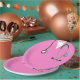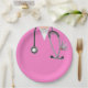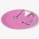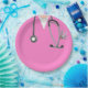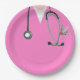 Creative medical doctor party plates for medical school graduation party or birthday celebration featuring pink scrubs, stethoscope and funny Swiss army knife.