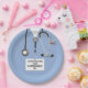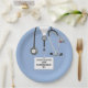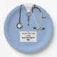 Creative doctor medical school graduation party plates featuring unique hospital scrubs and funny Swiss Army knife. To personalise edit text to add doctor's name.