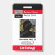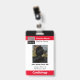 Easy to adjust company or business employee name badge with red colored striped background. All text is adjustable. Add your own company logo. Add your own company logo at the top of the badge. If the fast template adjustment does not work for your logo, click on the customize further option to be able to delete and add your logo to the card.