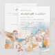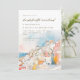 A modern Mediterranean bachelorette weekend invitation featuring a beautiful hand drawn watercolor coastal landscape illustration in pink, blue, yellow and white. "bachelorette weekend" is in modern script font. Add website details and QR to the reverse.