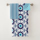Beautiful bathroom towel set printed in traditional Mediterranean turquoise blue, navy blue and white nazar evil eye symbols and mandala