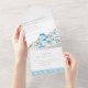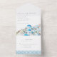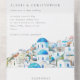 Mediterranean Destination Wedding All in One Invitation with a blue watercolor landscape illustration, Mediterranean tiles and tear off rsvp card.