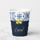 Personalise this stylish and elegant Italian Lemon Baby Shower paper cup, perfect for celebrating an excited mum-to-be! This chic paper cup features a vibrant navy blue background adorned with delicate, blue and white patterned Italian tiles, evoking the charm of Mediterranean decor. The design is brought to life with vibrant yellow watercolor lemons and lush green leaves, capturing the essence of a sun-kissed Italian lemon grove. Ideal for a baby shower party or picnic, this paper cup adds a touch of sophisticated citrus fruit flair to any celebration, making it a delightful addition to your lemon baby shower.