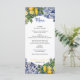 Hand painted traditional tiles from Portugal design with Mediterranean lemons. Azulejo blue and white floral leaf tile artwork. A beautiful Mediterranean design depicting yellow lemons with their greenery and blossoms against a blue and white vintage Portuguese pattern. The wedding text is elegantly framed with a white geometric shape. Unique Azulejo blue and white floral wedding menu card design with modern elements. Matching wedding invitations and other stationery items are also available.