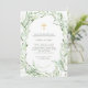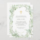 This elegant, stylish First Holy Communion invitation features a watercolor Mediterranean olive branches wreath, on a delicate white background with a faux gold cross.