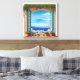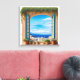Transport yourself to the beautiful Greek Isles with this idyllic scene! The artwork features a rustic, arched window frame, painted in warm terracotta and stone textures, opening up to an absolutely breathtaking coastal vista.