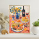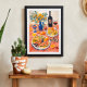 Celebrate the warmth and flavors of the Mediterranean with this vibrant hand-drawn still life illustration. This charming artwork features a beautifully arranged table filled with fresh citrus fruits, pasta, olives, figs, wine glasses, and rustic bottles, all set against a warm textured background. The composition captures the joy of sharing food, sunshine, and good company.