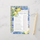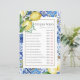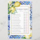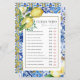 This elegant bridal shower "guess who bride or groom?" bridal shower game card features a white background with blue Mediterranean tiles, flowers and lemons/citrus in watercolor. Personalise it for your needs. You can find matching products at my store.