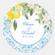 Seal your wedding favours, envelopes and welcome gifts with this elegant round sticker featuring Mediterranean blue tiles and fresh lemon florals. Perfect for Amalfi Coast weddings, bridal shower favours and destination welcome bags, this design adds a luxurious Italian coastal touch. The bright citrus artwork and classic ceramic motif create a fresh and sophisticated look. Ideal for envelope seals, favour packaging and guest welcome gifts. Pair it with the matching wedding suite for a beautifully coordinated celebration.