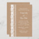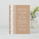 Beautifully illustrated lace decorates this medium burlap coloured rehearsal dinner invitation. It is shown on the basic paper; however, I recommend the weight and texture of the linen paper to further enhance that burlap feel. Note: lace is an illustration. This wedding collection is also available with ivory lace.