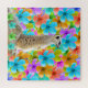 Pictured on a multi colored blossom background a meerkat keeps watch