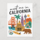 Catch some California vibes with this vibrant 'Meet Me in California' postcard, featuring a delightful collection of California icons in a fun doodle style! This whimsical illustrated postcard captures the diverse spirit of the Golden State, showcasing everything from the iconic Golden Gate Bridge and sunny palm trees to city skylines, the state capitol, and a classic surfboard ready for the waves. The playful illustrations and clear lettering make this postcard a unique and memorable tribute to California, USA.