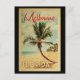 A uniquely retro mid-century modern Melbourne Florida art print in vintage travel poster style. It features a curved palm tree on sandy beach with ocean under a blue cloudy sky.